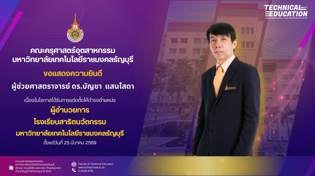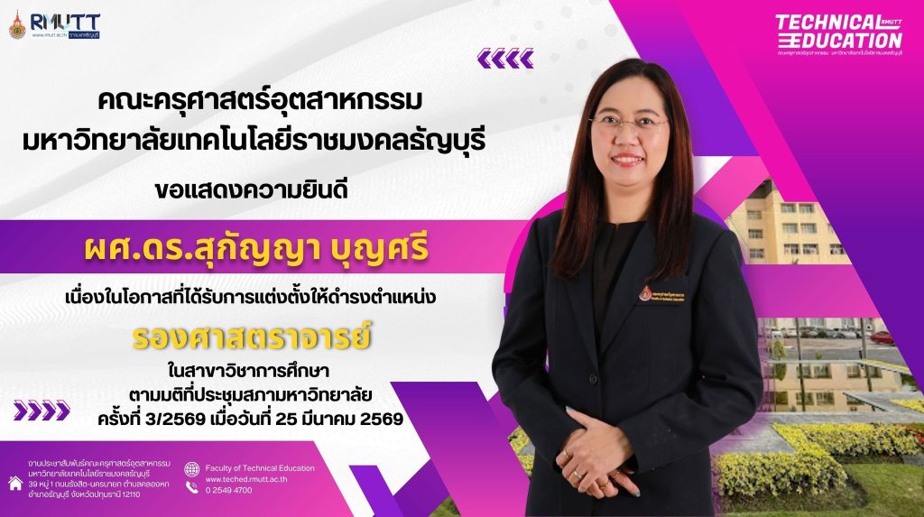Published by ณัฐภณ หรรษกรคณโชค on 21/02/2018 ขอแสดงความยินดีกับ ผู้ช่วยศาสตราจารย์ณัฐ แก้วสกุล ได้รับแต่งตั้งให้รักษาราชการแทนในตำแหน่ง ผู้อำนวยการกองพัฒนานักศึกษา มหาวิทยาลัยเทคโนโลยีราชมงคลธัญบุรี ตั้งแต่วันที่ 12 กุมภาพันธ์ พ.ศ.2561 Share0 ณัฐภณ หรรษกรคณโชค Related posts26/03/2026คณะครุศาสตร์อุตสาหกรรม มทร.ธัญบุรี แสดงความยินดี ผศ.ดร.สุกัญญา บุญศรี ได้รับแต่งตั้งเป็นรองศาสตราจารย์ สาขาวิชาการศึกษาRead more25/03/2026คณะครุศาสตร์อุตสาหกรรม จัดโครงการแลกเปลี่ยนเรียนรู้และสังเคราะห์ข้อมูล ถอดบทเรียนการทำงานของสถานศึกษา รุ่นที่ 3–7 โดย กสศ. และ 4 มหาวิทยาลัยเครือข่ายRead more25/03/2026คณะครุศาสตร์อุตสาหกรรม มทร.ธัญบุรี ร่วมแสดงความยินดี ผู้ช่วยศาสตราจารย์ ดร. บัญชา แสนโสดา ในโอกาสได้รับแต่งตั้งเป็นผู้อำนวยการโรงเรียนสาธิตนวัตกรรมRead more Comments are closed.