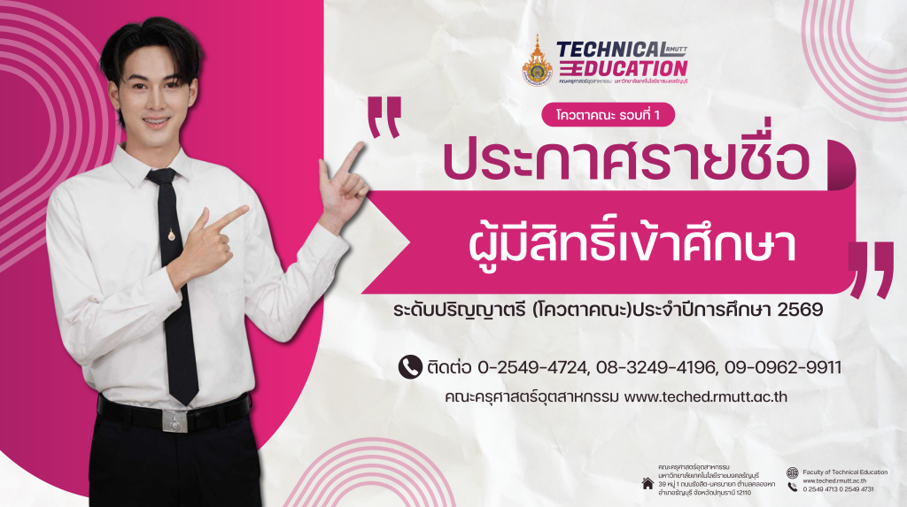 Published by ธิดารัตน์ พรหมมินทร์ on 28/08/2025 ผลการสอบคัดเลือกเข้าเป็นพนักงานพิเศษเงินรายได้ สายสนับสนุน ตำแหน่ง นักวิชาการศึกษา ประจำฝ่ายพัฒนานักศึกษา คณะครุศาสตร์อุตสาหกรรม มหาวิทยาลัยเทคโนโลยีราชมงคลธัญบุรี ได้เปิดรับสมัคร และได้ดำเนินการสอบคัดเลือกบุคคล เข้าบรรจุเป็นพนักงานพิเศษเงินรายได้ สายสนับสนุน ตำแหน่ง นักวิชาการศึกษา ประจำฝ่ายพัฒนานักศึกษา จำนวน 1 อัตรา นั้น รายละเอียดเพิ่มเติม>>>คลิก<<< Share0 ธิดารัตน์ พรหมมินทร์ Related postsประกาศรับรายชื่อ 6807/11/2025รายชื่อผู้มีสิทธิ์เข้าศึกษาในระดับปริญญาตรี ปีการศึกษา 2569 (โควตาคณะ รอบ1)Read moreสำเนาของ แสดงความยินดีกับศิษย์เก่า03/11/2025คณะครุศาสตร์อุตสาหกรรม ราชมงคลธัญบุรี ขอแสดงความยินดี นายมารุต สกูลแพทย์Read more574403248_1336496898271190_5544697811626961188_n01/11/2025นักศึกษาหลักสูตรครุศาสตร์อุตสาหกรรมดุษฎีบัณฑิต เข้าร่วมประชุม Focus Group เก็บข้อมูลงานวิจัยประกอบดุษฎีนิพนธ์Read more Comments are closed.