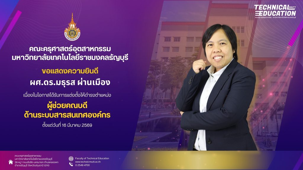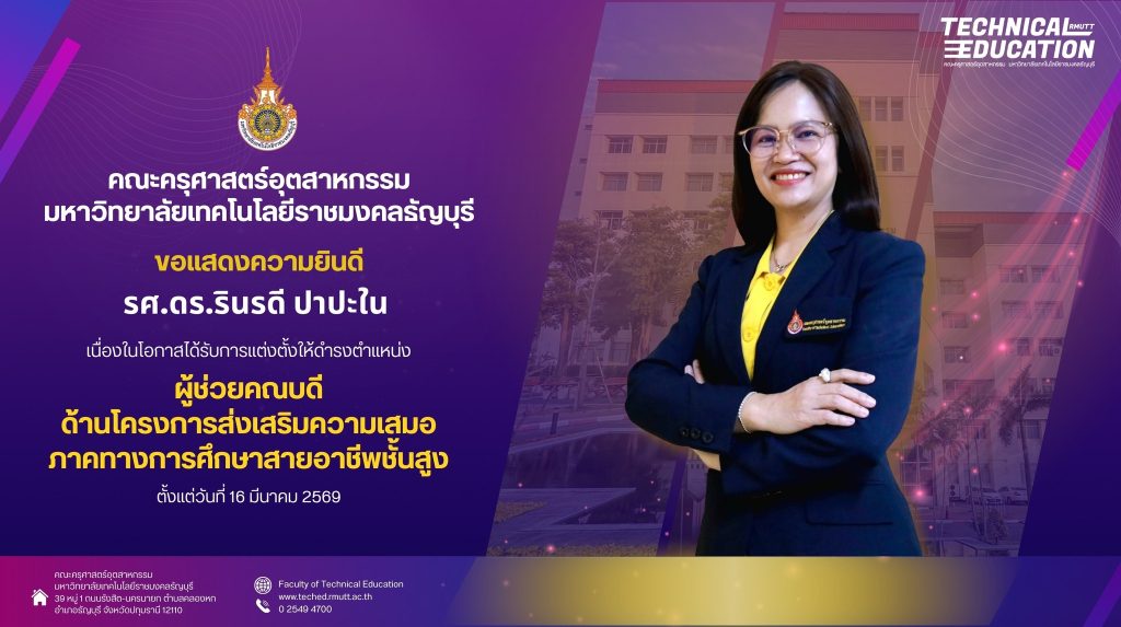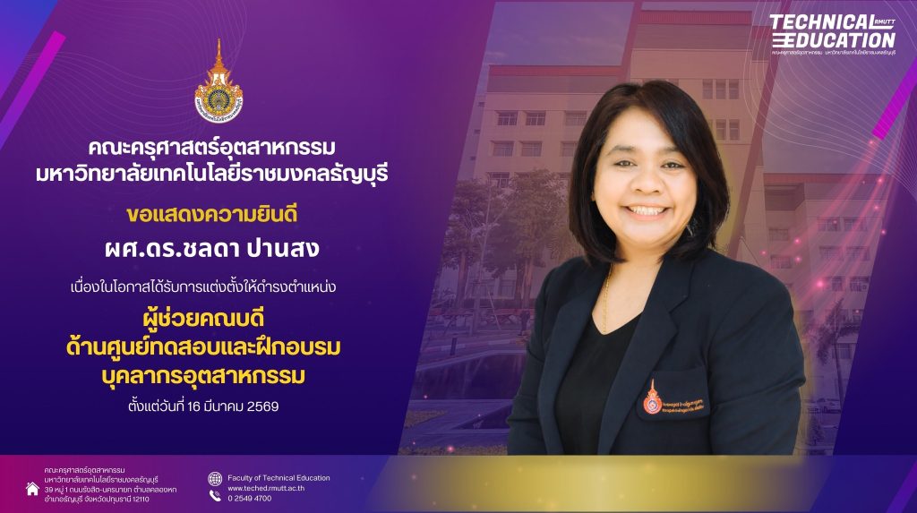 26/03/2026Published by สิรินันท์ นันทะสอน on 26/03/2026คณะครุศาสตร์อุตสาหกรรม มทร.ธัญบุรี แสดงความยินดี ผศ.ดร.สุกัญญา บุญศรี ได้รับแต่งตั้งเป็นรองศาสตราจารย์ สาขาวิชาการศึกษา […]